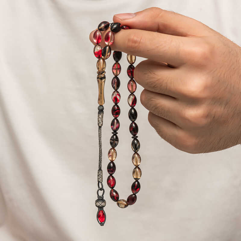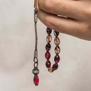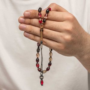 Kehribar, çam ağacı reçinesinin toprak altında uzun yıllar boyunca birikerek oluşan bir maddedir. Hemen hemen taş ile aynı sertliktedir fakat yoğunluğu düşüktür. Çam kokusu yayar. Oluşumu uzun zaman aldığından ve yapay olarak yapılamadığından değerli bir maddedir. Sıkma kehribar ise kehribar taşından farklı olarak onun özelliklerini taşıyan, görüntü itibariyle ona benzeyen fakat gerçek olmayan bir malzemedir. Ülkemizde ve dünyanın bir çok yerinde kehribar taşından çeşitli malzemeler üretilmiştir. Ülkemizde en yaygın olarak tesbih üretilmektedir. Kehribar tesbihler elde ısındıkça kehribar benzeri bir koku verir ve renk değiştirir. Bir çok rengi vardır. Hatta iki rengin birleşiminden oluşan kehribar tesbih modelleri de vardır. Genellikle gümüş püskül ile kullanılır veya sistemli olarak da kullanılabilir. Ülkemizin güzide tesbih ustaları bu malzemeyi sıklıkla işlemek suretiyle çeşitli sanat eserleri meydana getirirler. Bu tesbihler de koleksiyonerler tarafından alınıp satılmaktadır. Gümüş 1000 ayar kazaz püsküllü sıkma kehribar tesbih modeli de günlük hayatta kullanılabilecek çok şık bir tesbih çeşididir. Özel günlerin vazgeçilmez hediyesi sıkma kehribar tesbihler erkekler için doğum günü, sevgililer günü ve babalar günü gibi özel zamanlarda hediye olarak tercih edilebilir. Gümüş kazaz püsküllü sıkma kehribar tesbih modeli diğer kehribar tesbih modellerinde olduğu gibi tamamen el emeği ile imal edilmiştir.