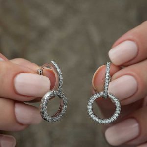 Günlük kullanıma uygun minimalist modellerden, davetlerde kıyafetlerinizi tamamlayacak daha gösterişli tasarımlara kadar, gümüş küpeler her an sizlerle birlikte. Işıltılı iç içe geçmiş halkalar, çift olmayı tekten daha iyi hâle getiriyor. Bu koleksiyonda hem kendiniz, hem de sevdikleriniz için mutlaka uygun bir küpe bulacaksınız. Bu şık iç içe geçmiş halka küpe 925 ayar gümüşten imal edilmiştir. Gümüş üzerine rodyum kaplama yapılmıştır. Rodyum kaplama yapılan ürünler parlaklığını uzun süre muhafaza eder. Tüm bayan küpelerinde olduğu gibi gümüş iç içe geçmiş halka bayan küpe de el emeği ile üretilmiştir. Gümüş ve değerli taşlar nedeniyle ürün ağırlığında ± %10 sapma olabilmektedir.