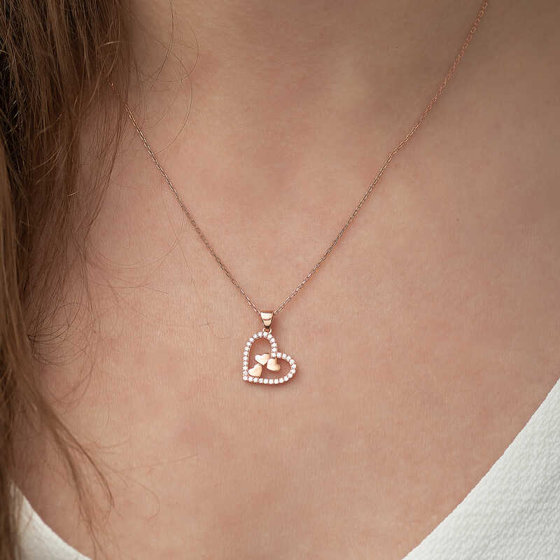 Gümüş Rose Kalbin İçinde Üç Kalp Kolye